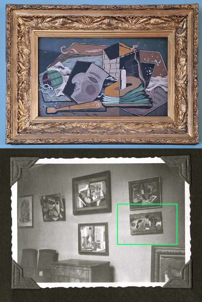 Left: Fritz Wiegmann (1902–1973), Still Life with Mask, 1928, oil on canvas, b+p Collection, Würzburg. Below: The painting in the artist’s apartment, 1928. Does the current form of presentation alter the integrity of the work in comparison to its original context? Have any interventions or changes been made since 1928 that have compromised the integrity of the work? Are the current conservation conditions suitable for ensuring the long-term integrity of the painting, or do they pose risks of substance loss or irreversible changes?